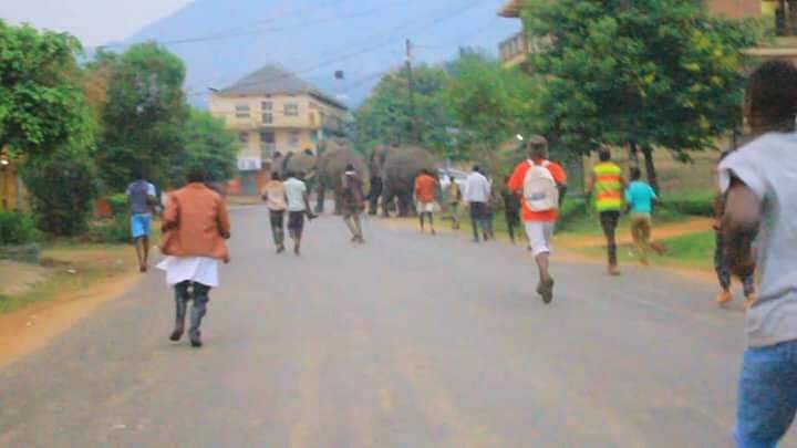 Five elephants strayed offfrom the Queen Elizabeth national park and roamed the streets of Kasese town on Wednesday causing a scene among locals, SoftPower News has learnt.